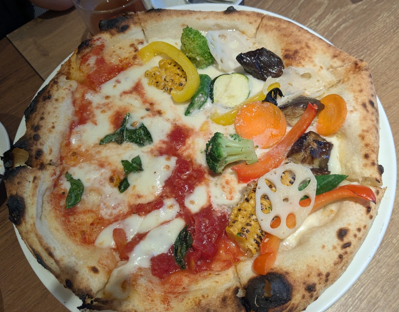 ピザはハーフ&ハーフ🍕で注文し、季節の野菜たっぷりで生地もおいしかったです😋