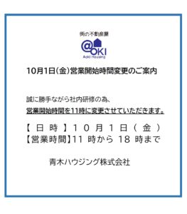 ◆◆10月1日(金)営業開始時間変更のご案内◆◆