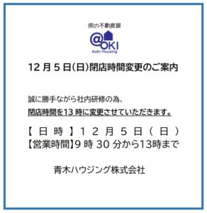 ◆◆12月5日(日)閉店時間変更のご案内◆◆