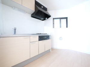 システムキッチンなので、調理道具をはじめ、調味料や食器などきれいに収納出来て