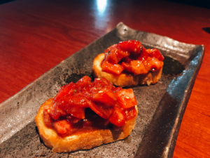 ユッケはパリっと焼かれたフランスパンにのせて、、