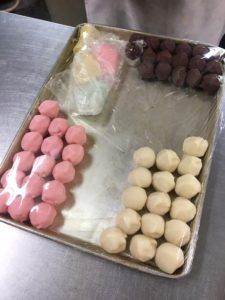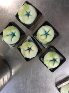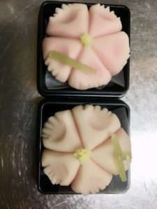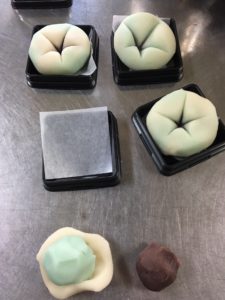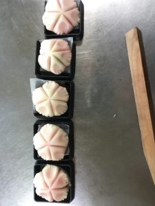 こちらも、ピンクと白のあんこを練って、普通のあんこをくるんだ後、ヘラで花びらをつくります。