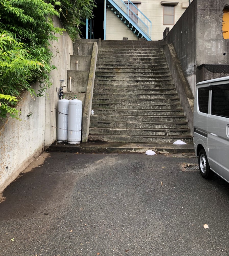 物件の顔ともいえるアパートの登り口ですが、隣地からの土や葉っぱの影響もあり大変な事に・・