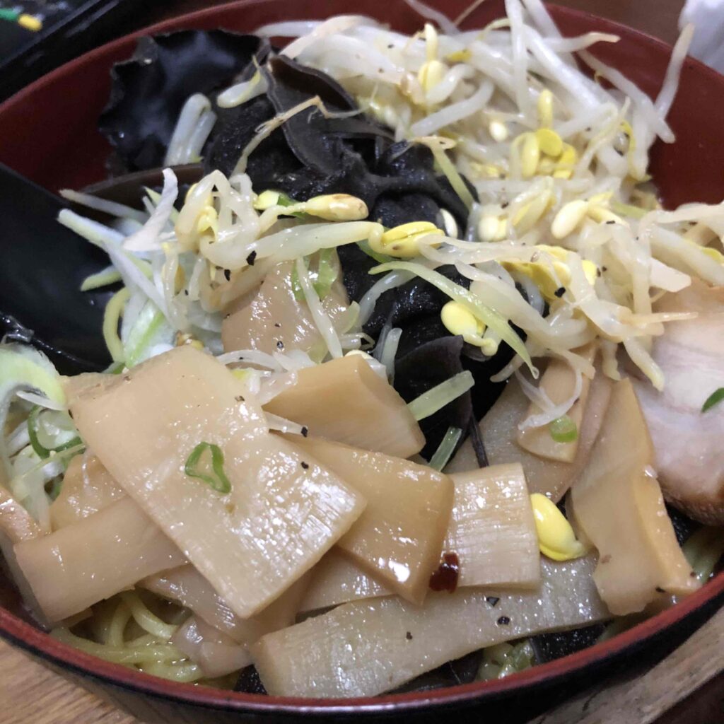 コチラは好物のきくらげとメンマ、豆もやしトッピングして