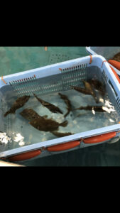 漁港でいけすの見学し(漁師さんの好意でみせてもらえました)