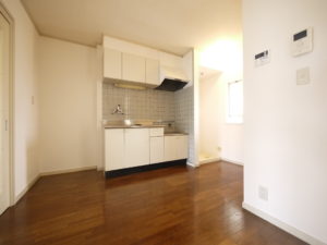 DK部分です。6帖の広さで、写真左側スペースは冷蔵庫置き場として、右側奥が洗濯機置場となっております。